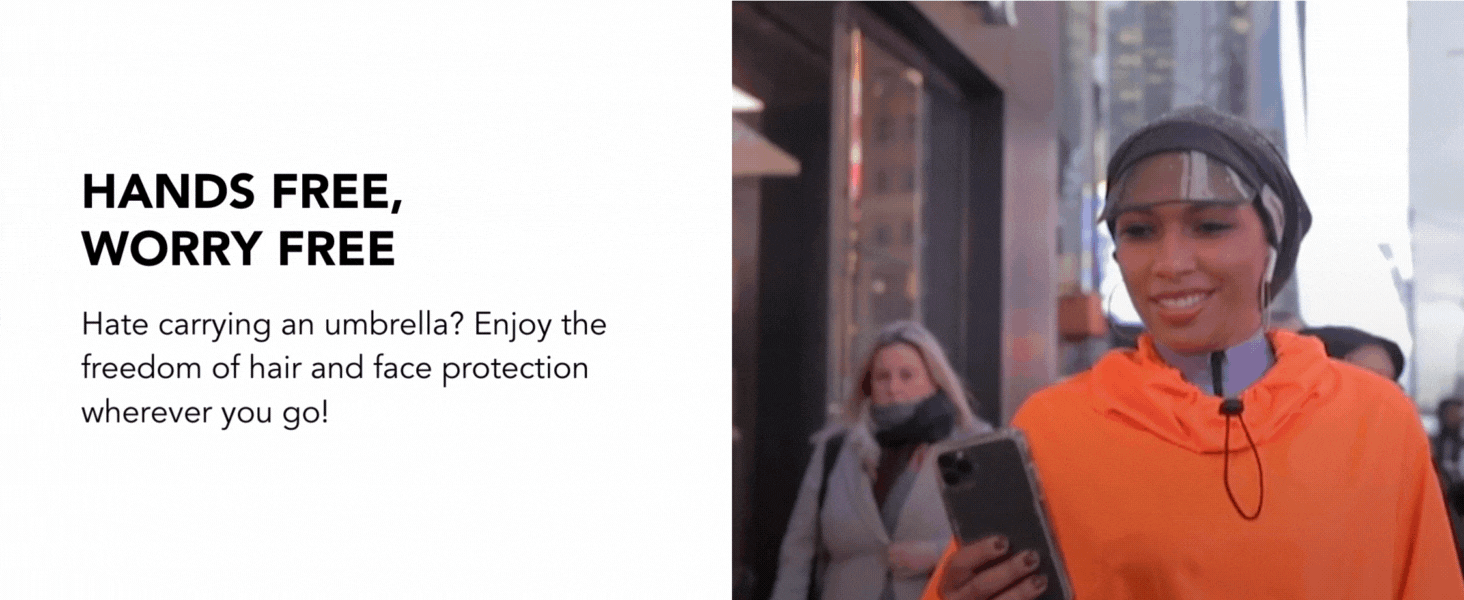 Protects your face, makeup, and glasses from the sun, with a little extra love on rainy days.