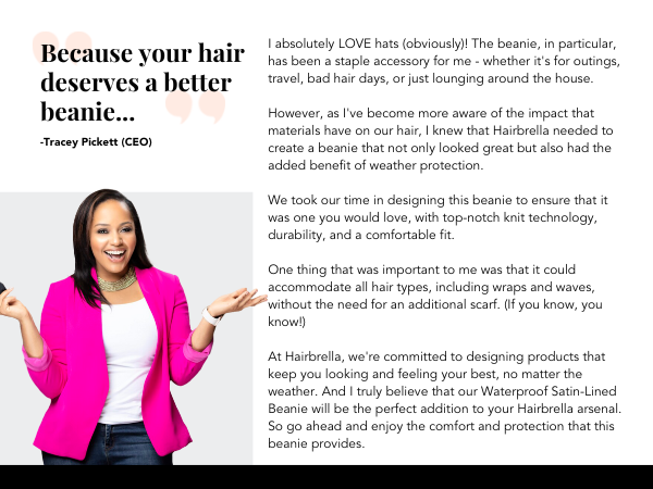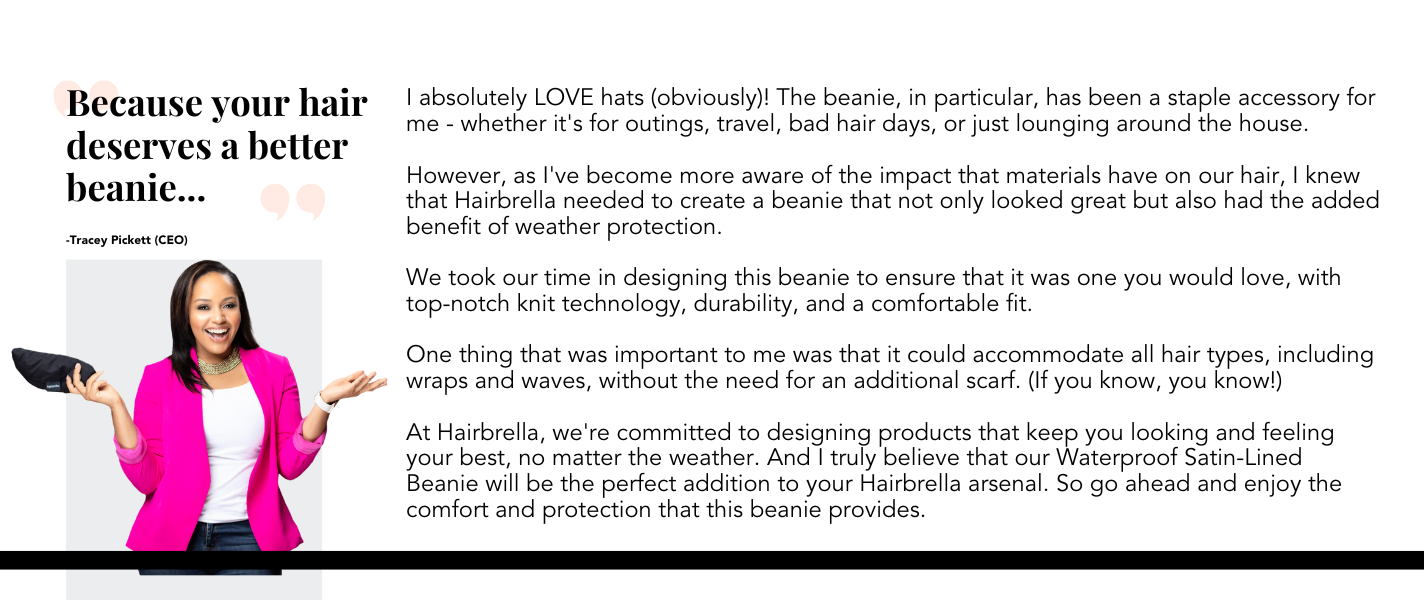 Slay the elements and stay flawless with Hairbrella's chic Satin-Lined Beanie! ⛈🚫 💁‍♀️ Guaranteed to keep your hair dry & style protected no matter the forecast. ✨
