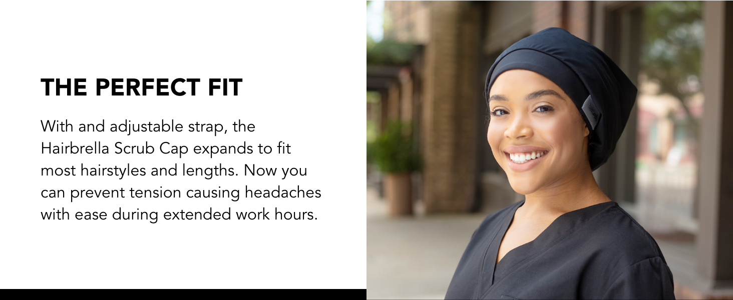 With an adjustable strap, the Hairbrella Scrub Cap expands to fit most hairstyles and lengths for men and women. Our working cap with buttons will prevent tension causing headaches with ease during extended work hours.
