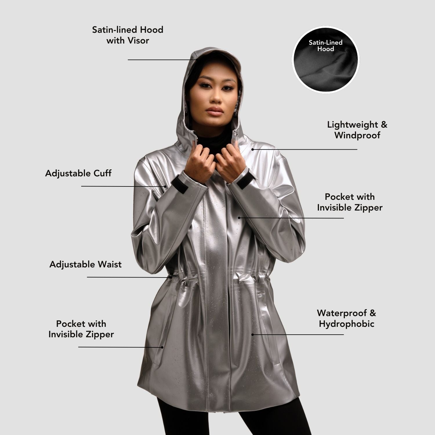 Engineered with our cutting-edge, lightweight waterproof and hydrophobic fabric, this chic rain jacket ensures you stay dry and dazzling, no matter the downpour.