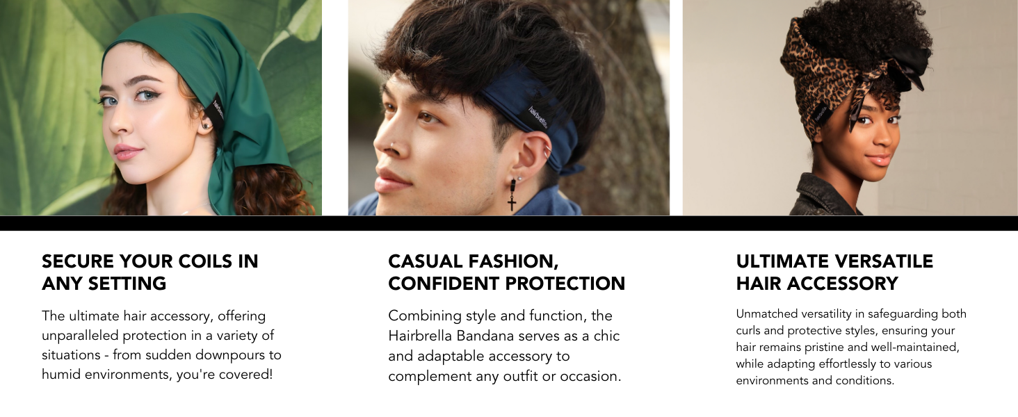 Your old bandana, although it's cute, isn't doing any favors for your hair. It's time for an upgrade! The NEW Hairbrella Bandana is a (protective) spin on one of your favorite accessories with all the Hairbrella features you already love and then some.