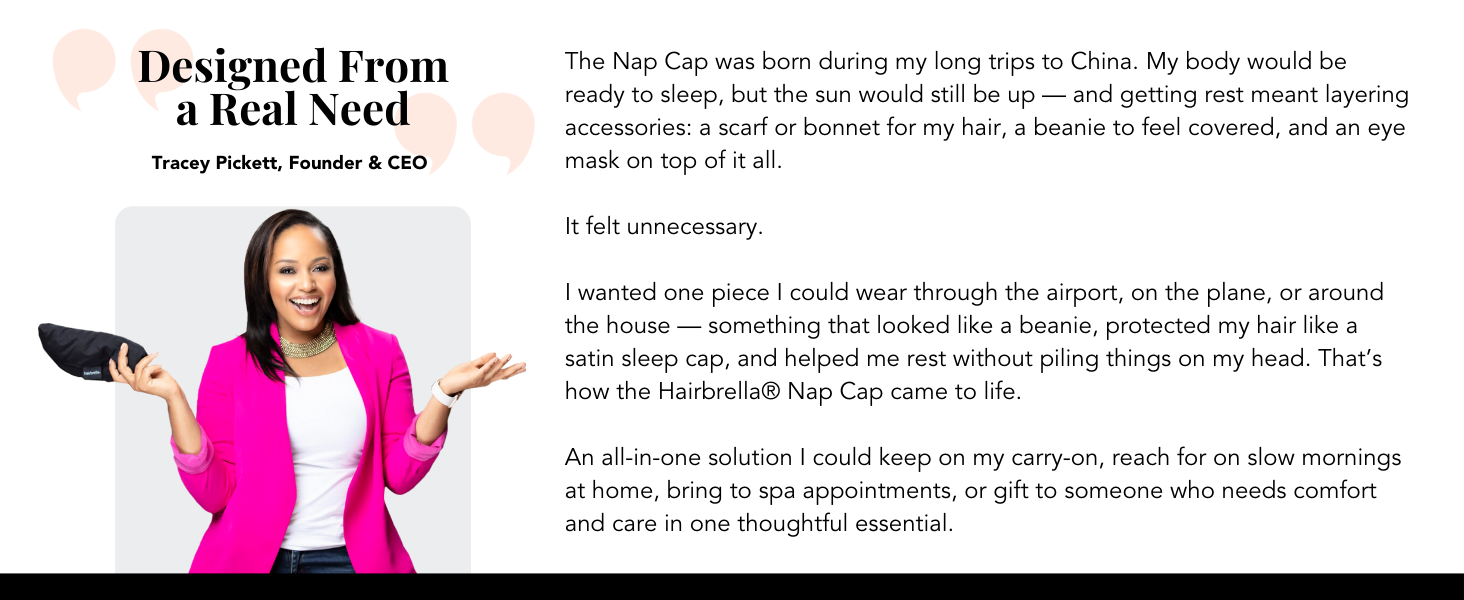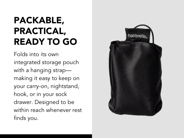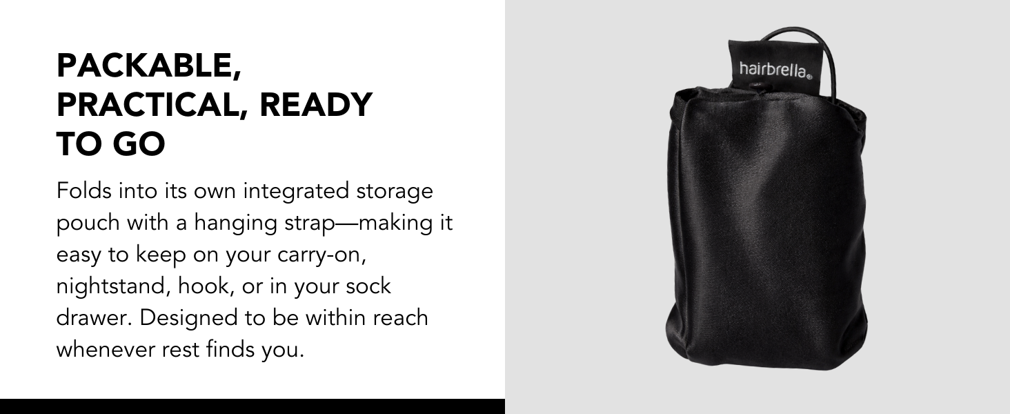 The Hairbrella Nap Cap™ reimagines the traditional sleep cap with intentional design and elevated comfort. Crafted with a premium 4-way stretch satin exterior, a cooling satin-lined interior, and a discreet built-in eye mask, it helps you truly power down while keeping your hair protected.