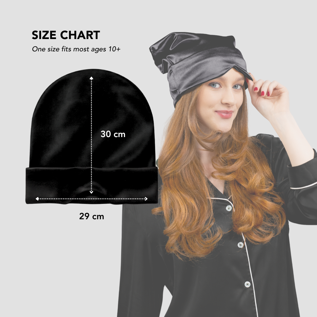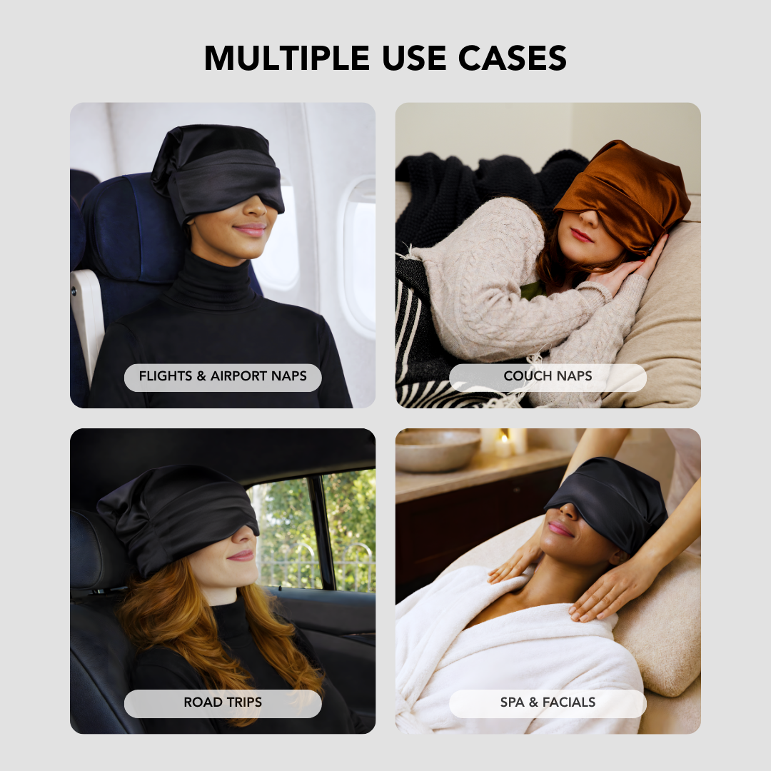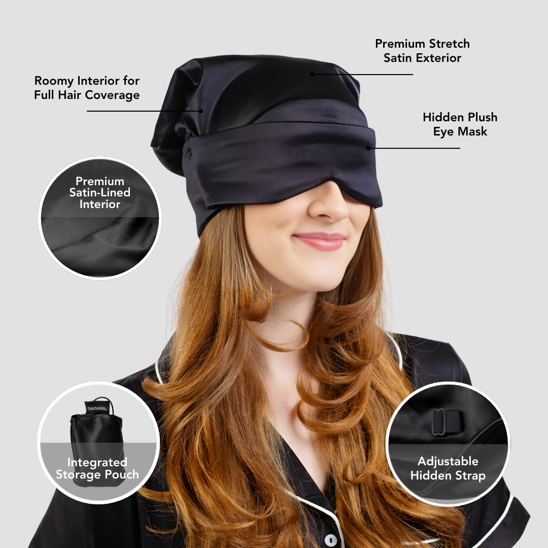 Meet the Hairbrella Nap Cap™—a satin-lined sleep cap with a built-in plush cooling satin eye mask, thoughtfully designed for sleep, travel, spa days, meditation, and everyday downtime.