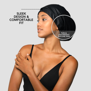 Introducing the world's first satin-lined and adjustable swim cap designed to keep your hair dry and style protected, even underwater!