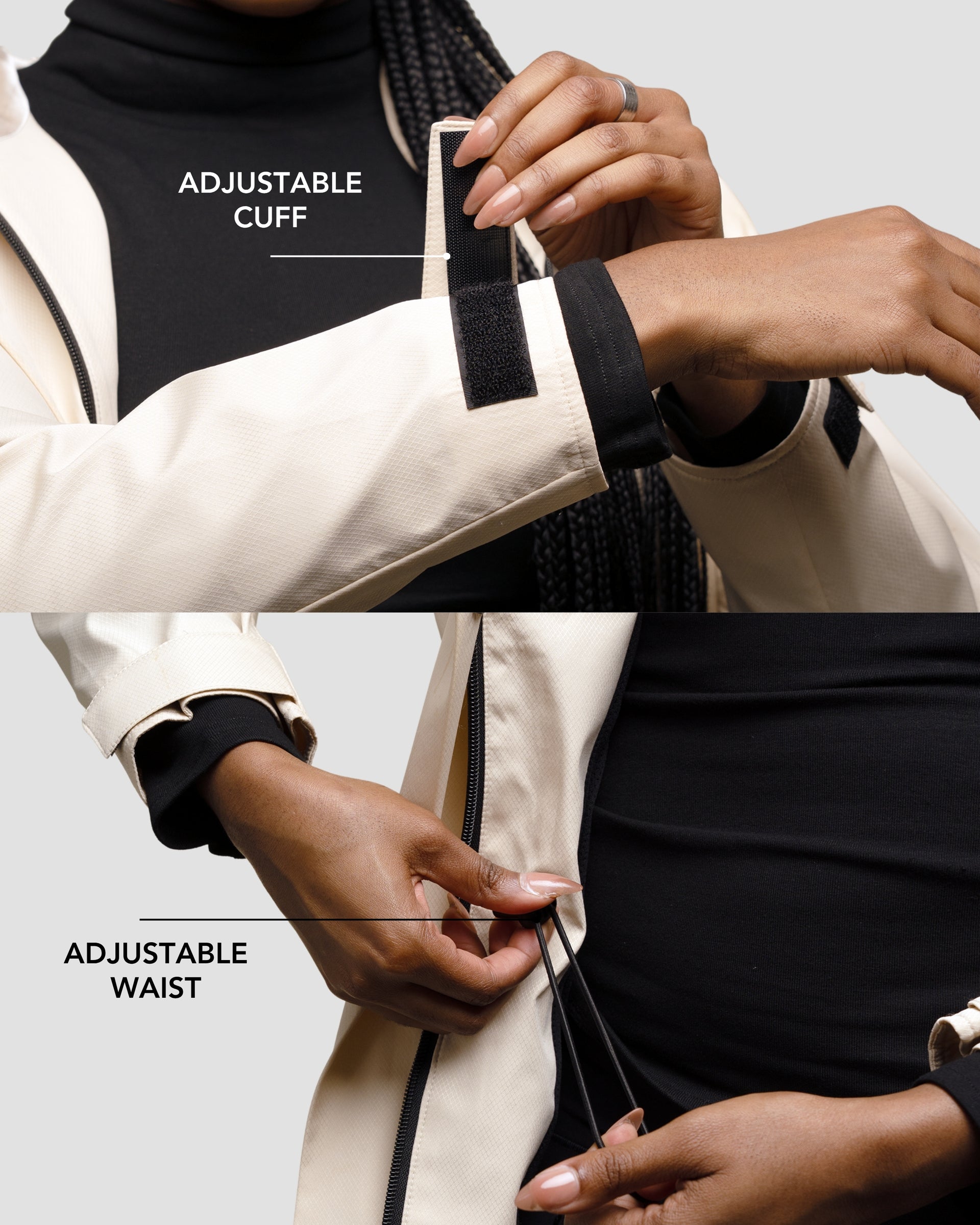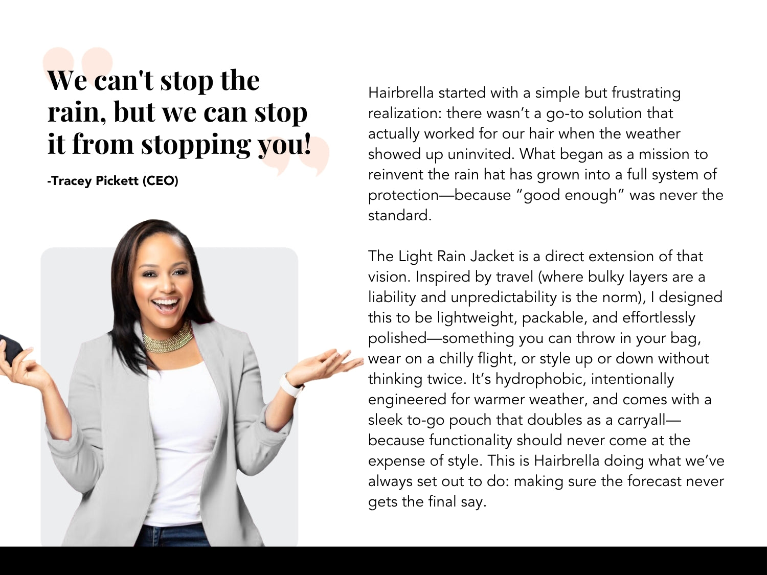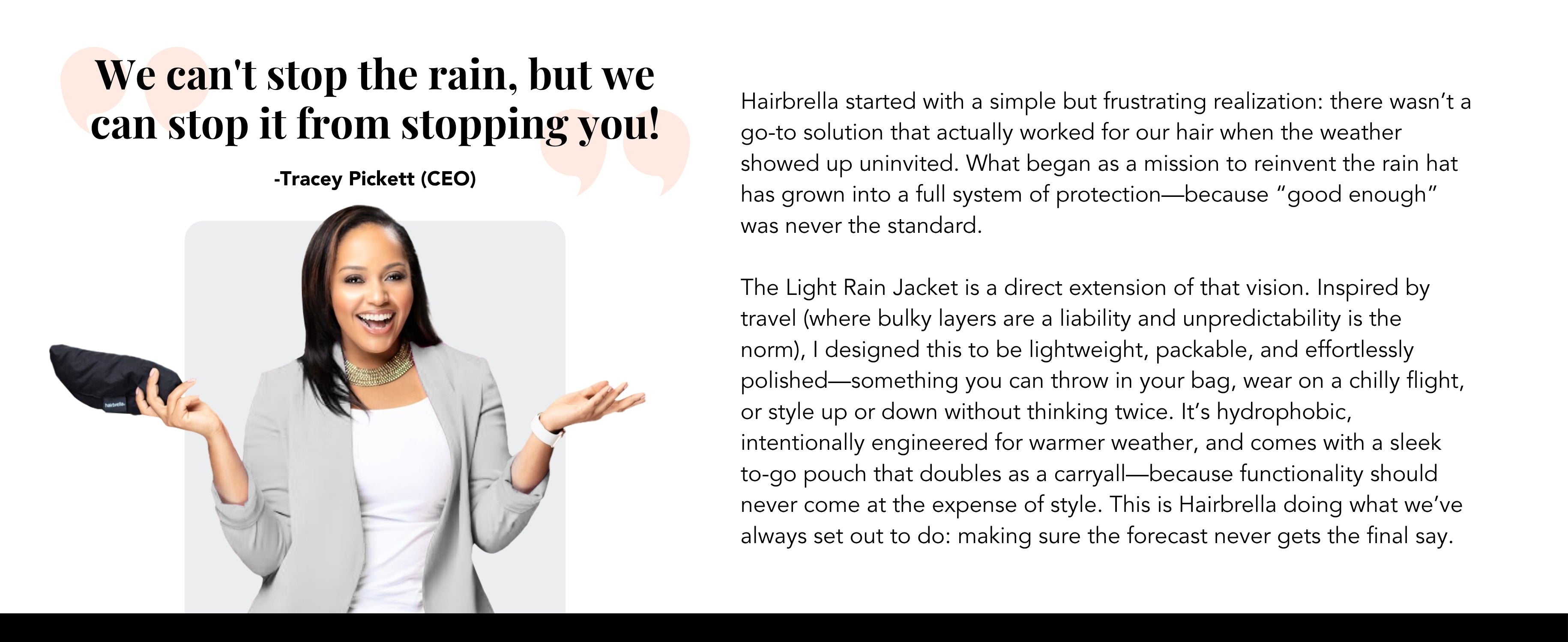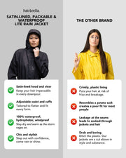 Introducing the Hairbrella Lite Rain Jacket—the ultimate fusion of weather protection and hair care innovation. Designed with our signature satin-lined hood and durable ripstop fabric, this jacket keeps you dry, protected, and polished—no matter the forecast.