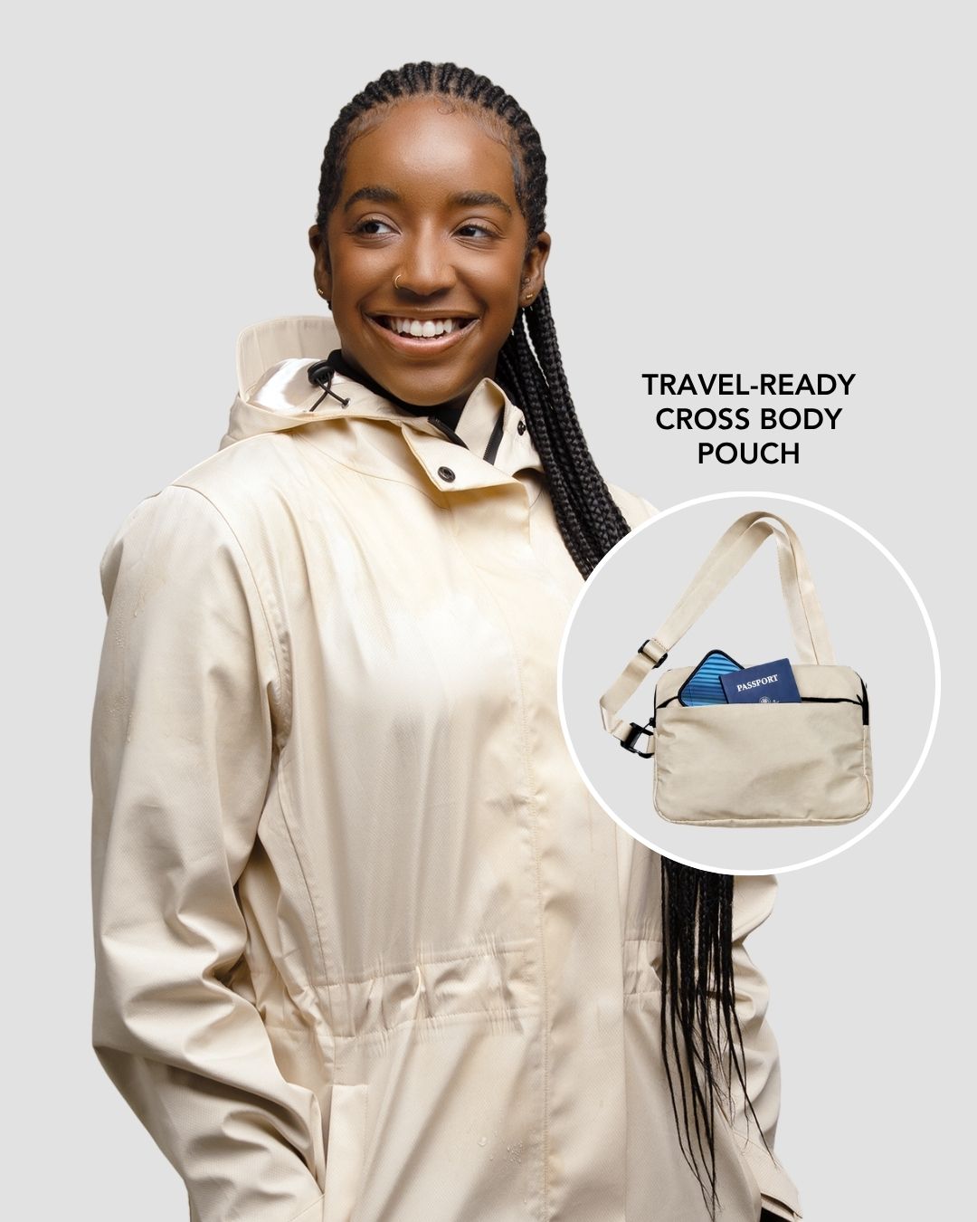 Folds into its own ripstop pouch—wear it crossbody for easy, hands-free carry wherever you go.